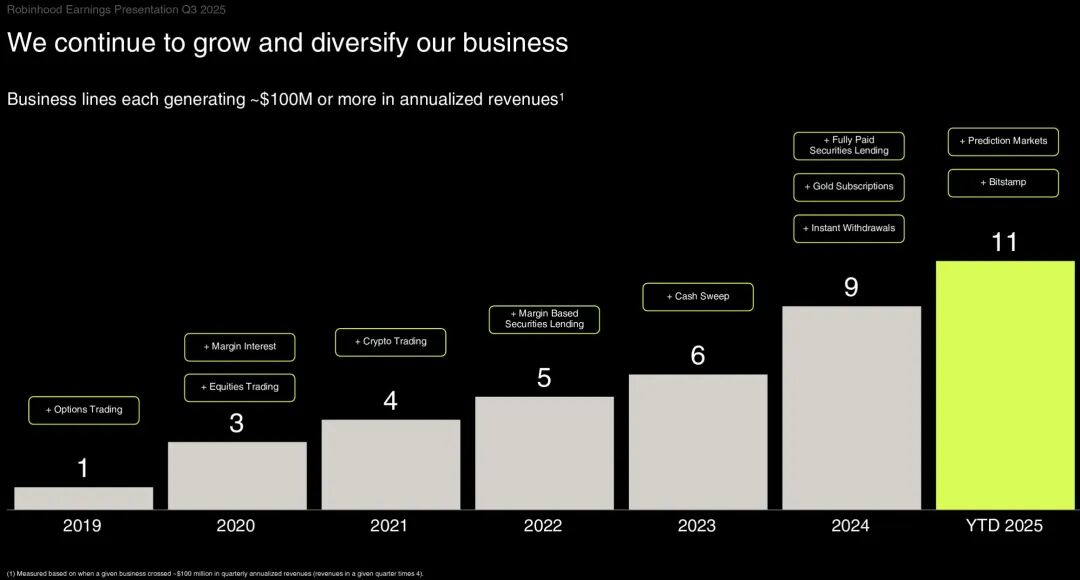 罗宾汉事件预测业务自发布以来合约累计交易超 40 亿份,其中三季度单季度就贡献了 20 亿份,后续还会推向更多市场。目前提供的预测事件大约有 100 多款,目前有券商估计明年能贡献 1.6 亿美元。