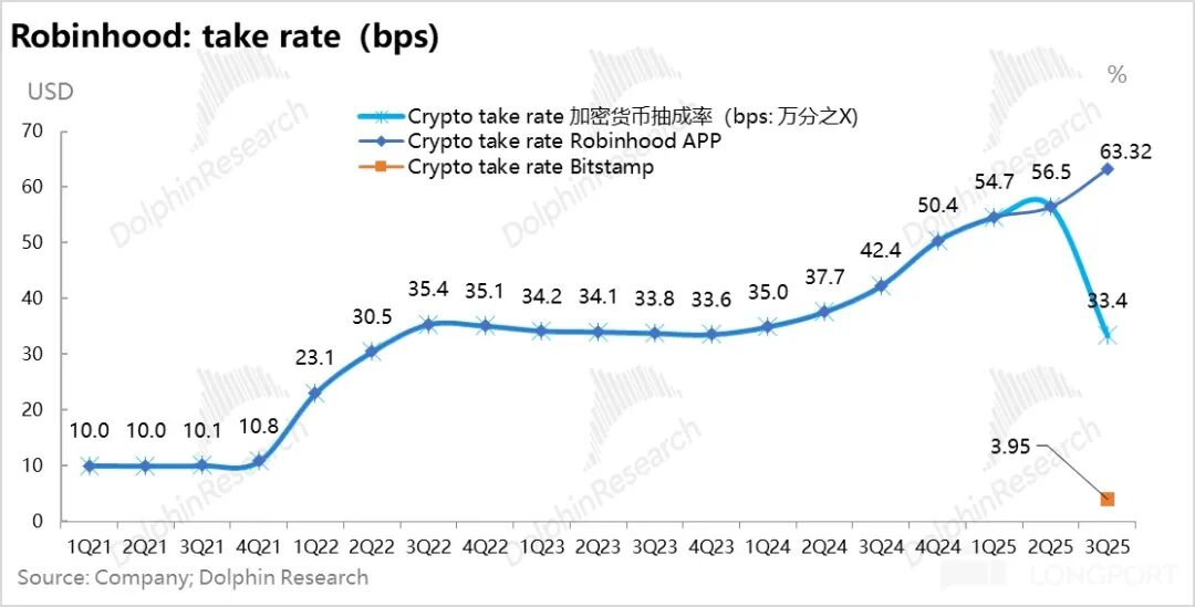 但它的收入仅仅 1600 万,变现率区区 3.95 个基点(Coinbase 机构业务大概 6 个基点),因此罗宾汉公司整体虚拟资产业务的变现率也被拖累到了 33 个基点。