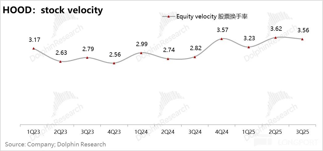 且在渗透过程中,整体客户资金保持了比较高的资金流通速度,换手率(股票交易量/股票平均 AUM)单季保持在 3.5 倍以上;
