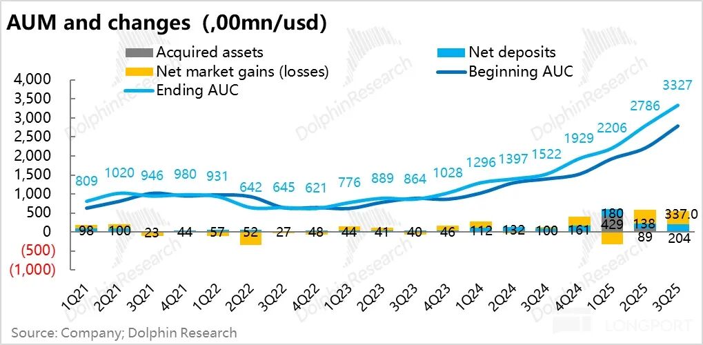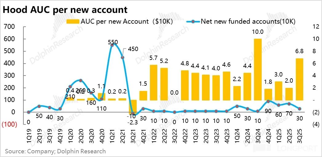 同时新吸纳客户资金 204 亿美金,折合新客的单客 AUM 已经上升到了 6.8 万。也就是说它现在的获客已经开始向传统所谓的 “老钱族” 渗透。
