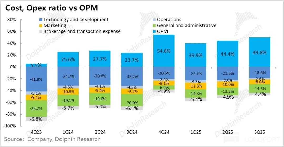 同时,公司与获客高度相关的销售费用在牛市中显得相当克制,环比仅增加 3%。只有管理费用因为前面说的薪资税问题,环比增长了 40%,达到了 1.85 亿。