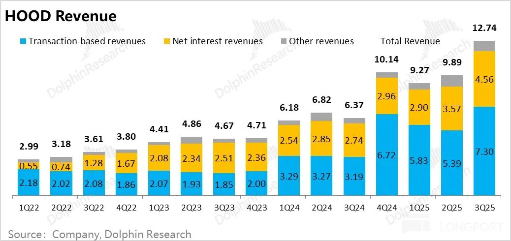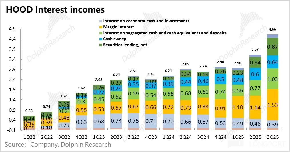 以上三项收入,再加上现金扫存(用户把闲钱通过 HOOD 平台购买外部银行理财)与公司自有资金利息收入,合计接近 4.6 亿美金,环比增长超 27%。