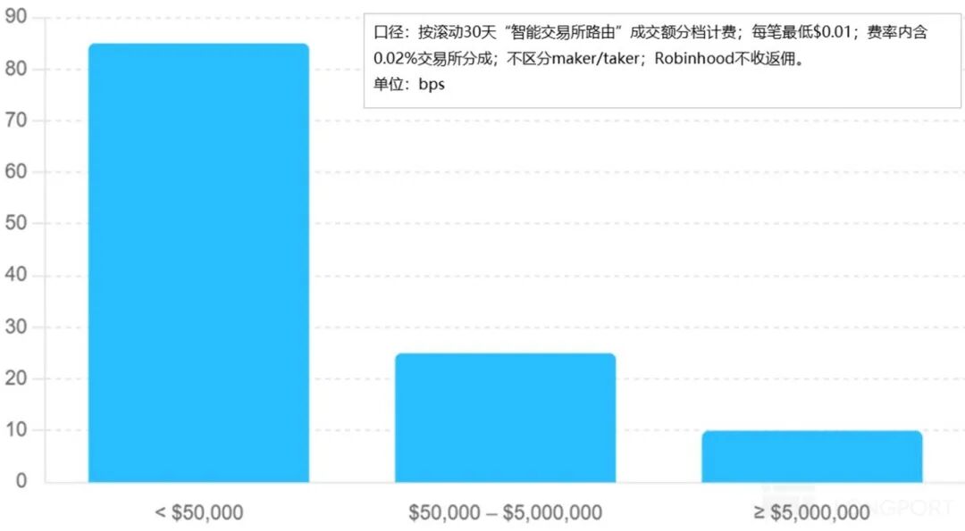 再次,虚拟资产变现率拉升期:目前对 HOOD 虚拟资产变现目前已晋升到两种路径:a 原本的 PFOF,大约是在 85 个基点,等于对用户隐形收费;b.智能订单路由:属于对用户显性收费,非订单批发变现模式下吃订单回扣的模式,按用户过去 30 天的成交量分层收费,定价在10–85 个基点。