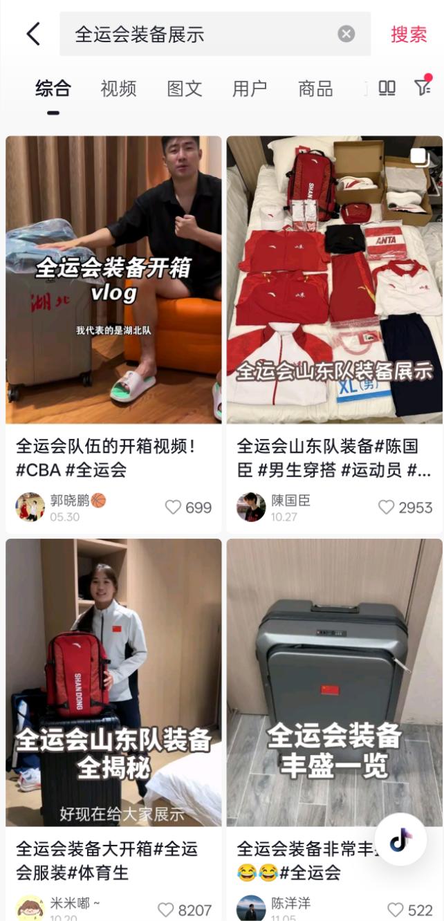 然而,如果还停留在仅从开幕式或后续赛场上品牌logo的露出而评判本届全运会的营销战果,无疑错过了最精彩的部分。本届赛会一个重要转变在于,装备赞助的传播主场,已从传统的电视转播镜头,大规模迁移至抖音、小红书等社交平台。如果你关注过各省运动员的社交账号,或许会在近期频繁刷到“全运会装备展示”的开箱视频。