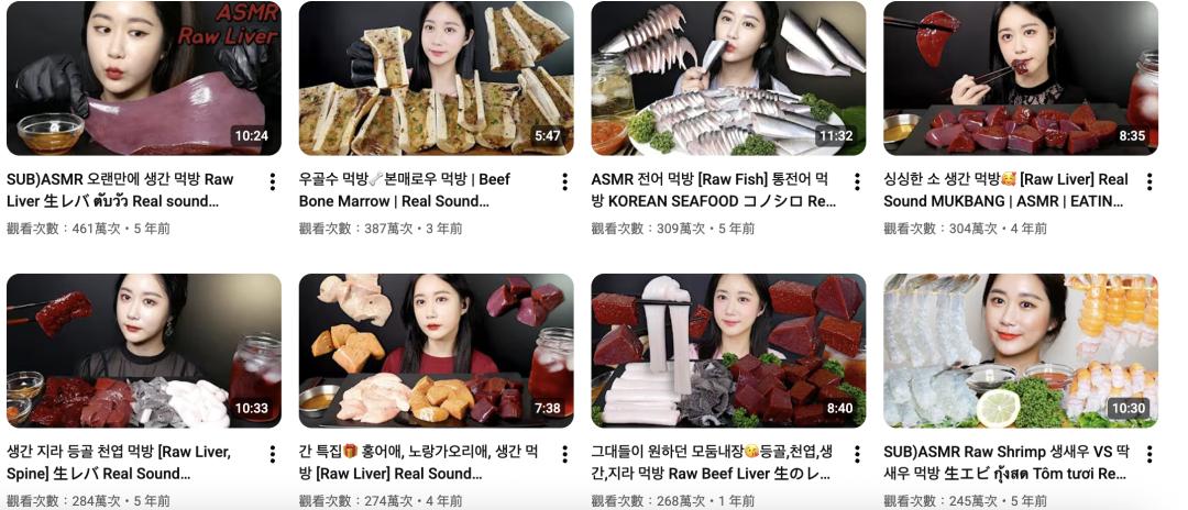同样让人丧失食欲的还有韩国吃播人,看起来“人畜无害”的吃播女顶流ONHWA,把一整盘生牛肝、牛骨髓在你面前一点一点优雅吃完,“脆生生”“血淋淋”这些词语在收音器的帮忙下,具象化了起来。