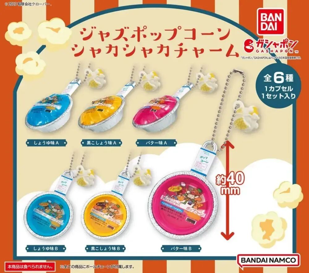 日本玩具厂商万代以クローバー的这款“怀旧煎锅爆米花”为原型,推出了迷你扭蛋系列爆米花。这是一款微缩模型玩具,300日元可以抽取一次——卖得比爆米花本体还要贵。这个模型不仅完整复刻了クローバー爆米花的外观,还设计了加热前、加热后两种版本,搭配可以摇晃出声的玩具结构,模拟爆米花“引爆”的体验。