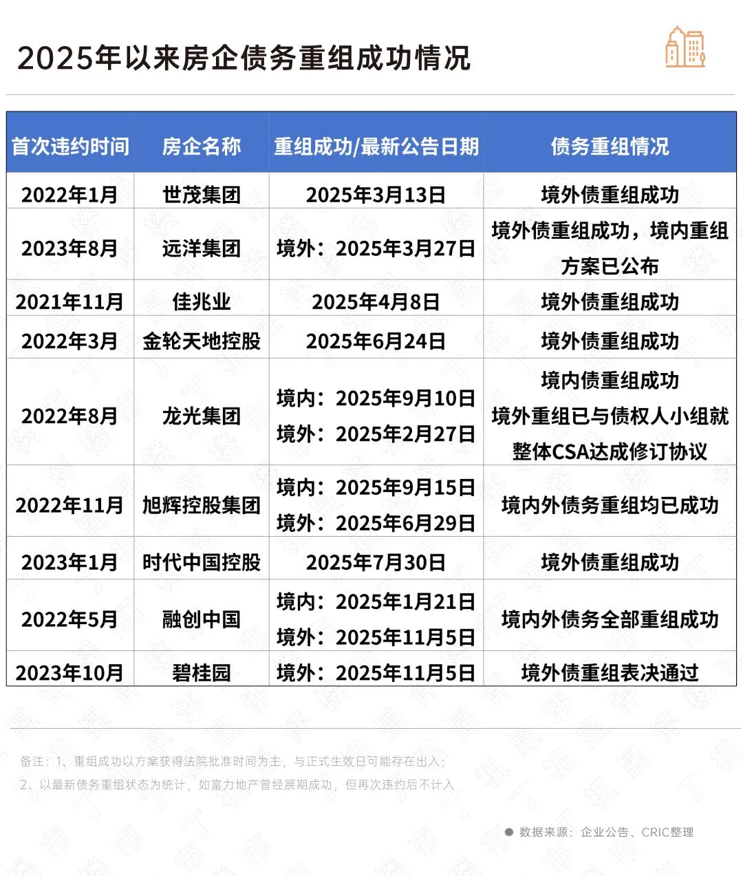 2025年,房企债务重组进程明显提速,其中龙头企业的方案接连落地,为市场注入了强劲信心。
