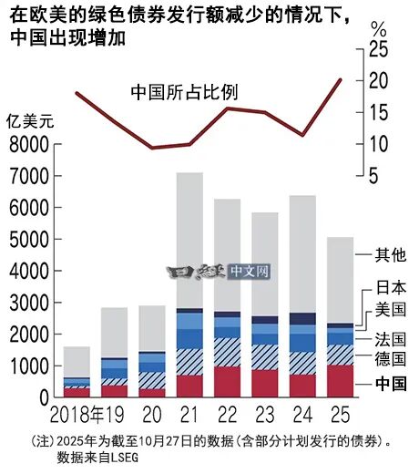 2025年的发行额截至10月下旬达到1018亿美元,按年度计算已创下历史新高,占全球总额的20%,位居首位。有观点认为,中国正在趁着欧美脱碳进程遇阻的间隙,试图掌握“绿色主导权”……