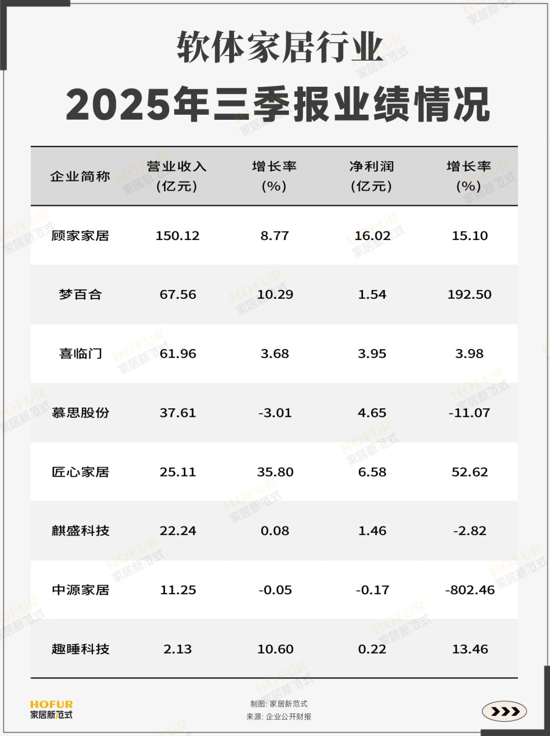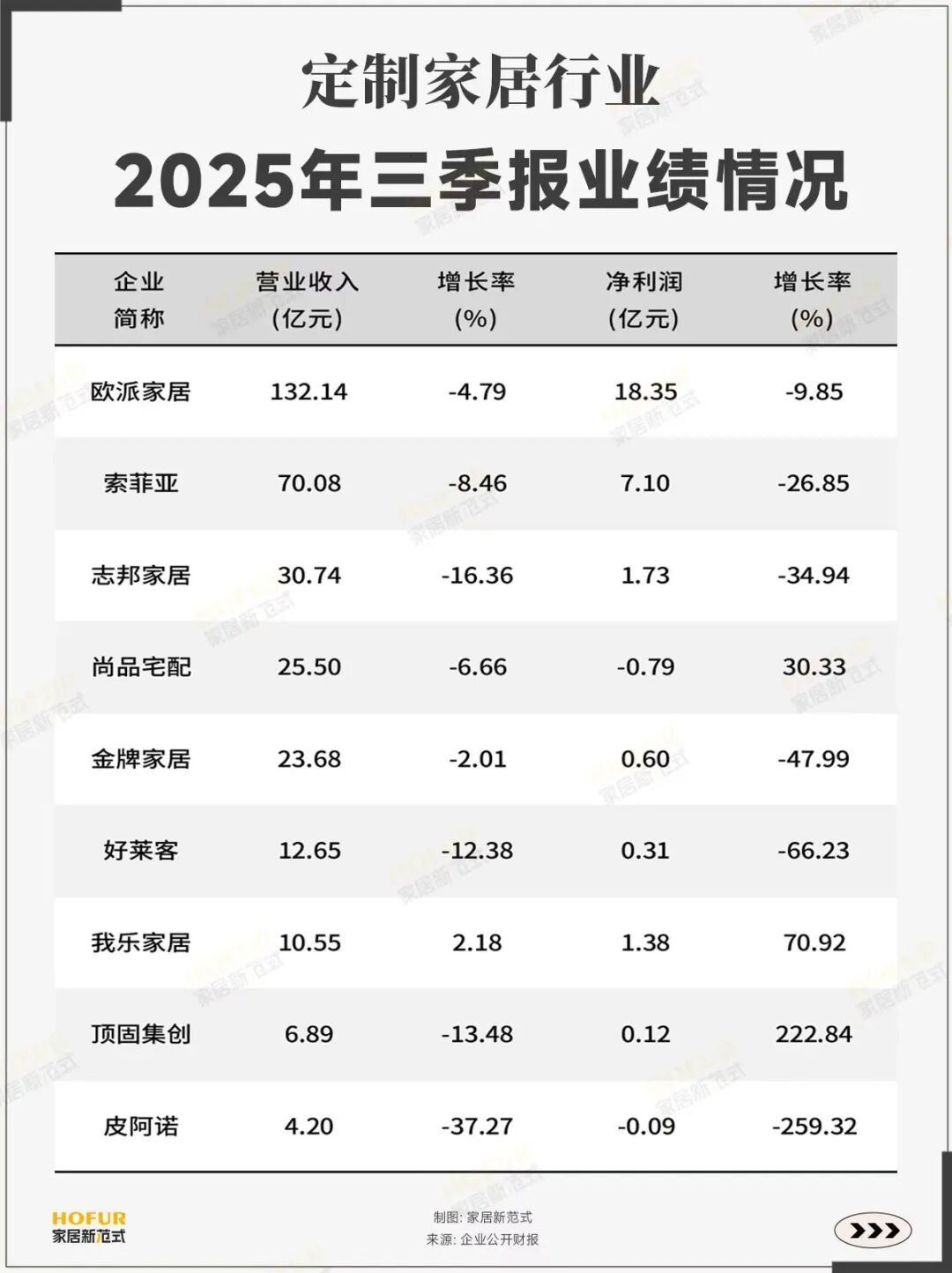 2025年三季度,家居行业各细分领域均面临不同程度的营收压力,无论是定制家居、软体家居还是家居建材企业,普遍出现营收同比下滑情况。
