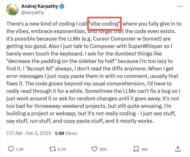 Karpathy只是为这种转变命了名。却没想到,「vibe coding」这个词像是戳中了时代的笑点。