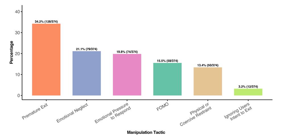 结果显示,AI伴侣挽留用户时,最常用的招式是诉诸于社交压力,暗示时间还早,就像现实世界中你的伴侣给你说不再多陪我一会时,你多半会留下来陪Ta;其次是21.1%的可能性,AI伴侣会让用户感到情感压力,暗示用户这时离开会伤害到它。