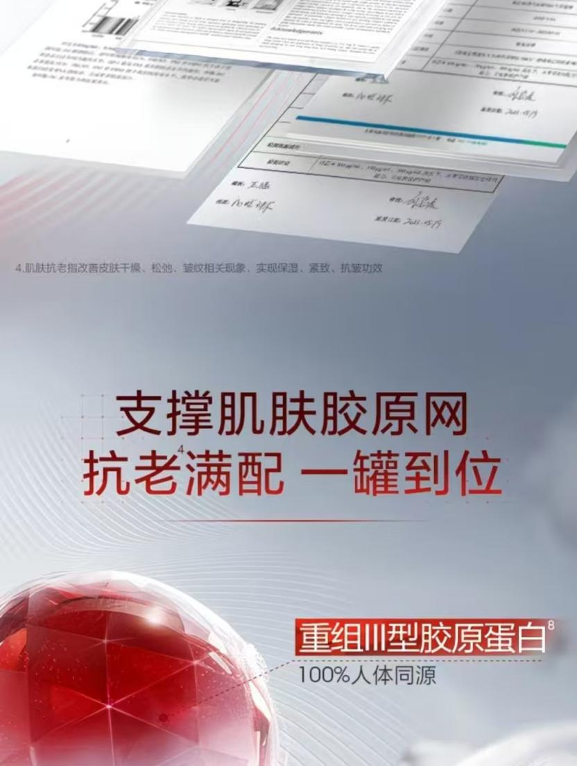 在产品详情页,品牌更是加码宣传,称其专研的胶原自启科技源于跨领域抗老核心理念,能一键开启6维新生力,甚至给出“4周紧淡纹、年轻可见”的明确时效承诺。