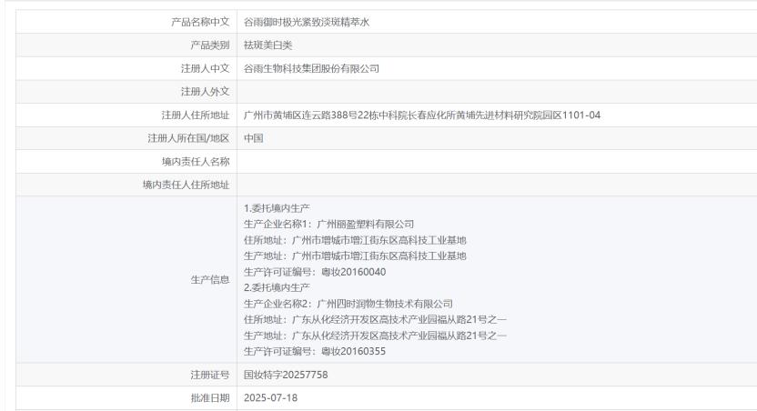 凤凰网《风暴眼》通过国家药品监督管理局官网查询发现,谷雨该套装中的“御时极光紧致淡斑精萃水”与“御时山参胶原紧塑光璨精华霜”确实为备案在册的“国产特殊化妆品”,但其产品类别明确为“祛斑美白类”。