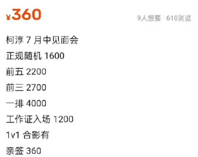 网络上有一份关于柯淳七月份见面会的黄牛报价单,正规随机票1600一张,第一排票价则要4000块,比一般的小爱豆见面会票价还要高点。