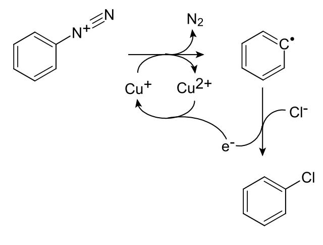 问题还是出在重氮盐上。因为重氮盐的暴脾气,如果直接用热分解的方法来释放氮气,反应很可能会失控,因此,铜离子成为了高压锅的压力阀,负担起了使反应缓和的重要作用。