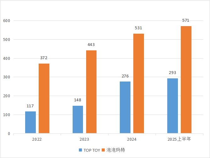 图:2022年-2025年上半年TOP TOY与泡泡玛特门店数量对比(含海外市场);数据来源:企业财报,36氪