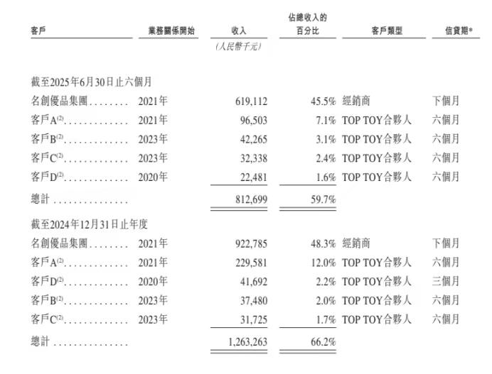 经销商则需要承担库存,即TOP TOY把产品卖给经销商,再由经销商卖给顾客,所以TOP TOY在经销渠道赚取的是供应链收入。母公司名创优品是其最大的经销商,招股书显示,2024年和2025年上半年,TOP TOY通过卖货给名创优品所实现的营收分别为9.23亿元和6.19亿元,占同期总收入的48.3%和45.5%。