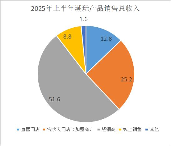 从营收结构来看,潮玩产品销售是其核心业务,截至2025年上半年,该业务的收入占比约97%。从渠道维度来看,经销商同期收入占比最高,接近50%;加盟商、直营门店、其他渠道则的占比依次递减。