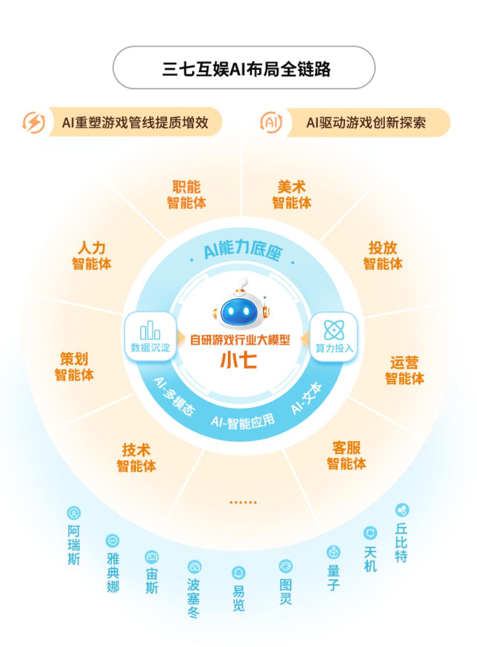 目前,第一个阶段就像现在入门AI一样,大家可以根据不同的需求选择AI工具,最终由人来决定一些关键的选择。第二个阶段就是AI可以完全颠覆产品以往的生产线,比如三七互娱基于AI能力底座、打造涵盖智能化产品层与业务应用层的AI架构,自主研发了游戏领域行业大模型「小七」,构建「小七」智能体平台,覆盖市场分析/产品立项/美术设计/开发辅助/广告投放/运营分析/智能客服/通用办公等各业务领域。