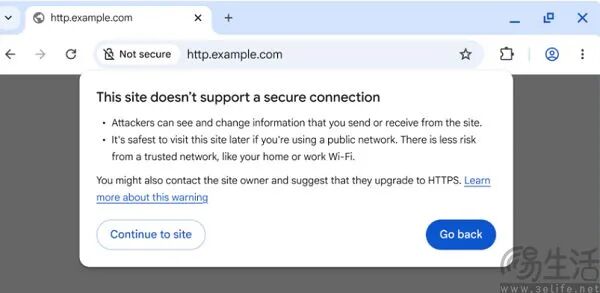 从Chrome 154版本开始,一旦用户尝试访问HTTP网站,Chrome就会立刻进行弹窗警告。除非选择“无视风险,坚持访问”,否则Chrome将拒绝加载。需要注意的是,一旦用户对某个HTTP网站放行,下次访问时Chrome就会默认执行,只有用户在清除浏览器数据后才需要重新进行确认,从而避免误伤。