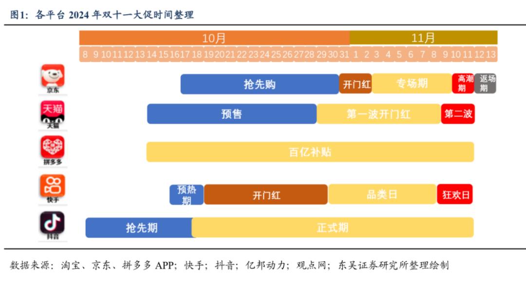 快手早在10月7号国庆节假期末尾就开始抢跑;两天的10月9日,京东也进入了“双十一”节奏,同日,抖音电商也宣布正式启动“双十一”好物节。六天之后的10月15日,淘宝天猫的“双十一”也如约而至。