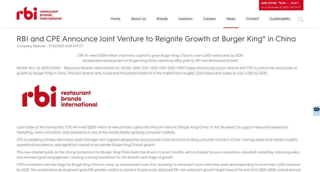 11月10日,拥有汉堡王、Tim Hortons和Popeyes等诸多餐饮品牌的RBI集团(Restaurant Brands International)、CPE源峰共同宣布,CPE源峰与RBI达成战略合作,双方将成立合资企业(汉堡王中国)。交易完成后,CPE源峰将持有汉堡王中国约83%的股权,RBI将保留约17%的股权。