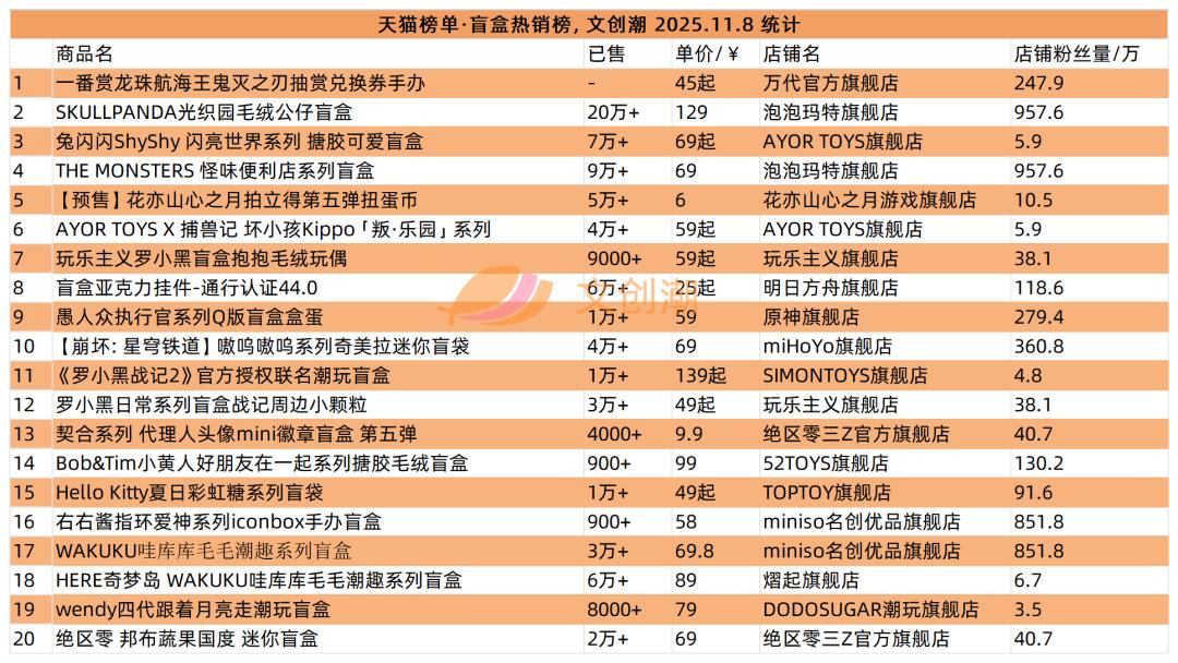 本期天猫榜单的盲盒热销榜,第一名再度被万代一番赏的兑换券占据。