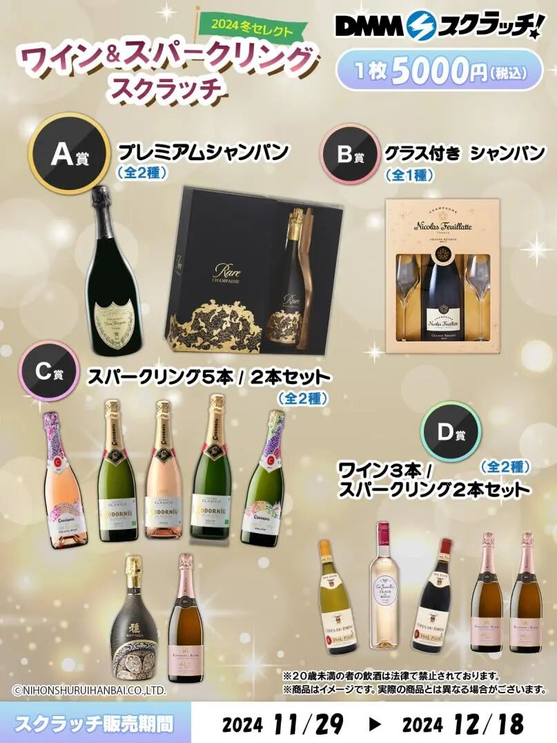 如今年与知名连锁日式定食店すた丼(烧肉饭)的合作抽赏,4档奖品全是消费券,A赏为一年免费消费券,B赏为任选一款喜欢的盖饭/定食/咖喱/拉面免费。单抽390日元。DMM与香槟酒的合作抽赏,奖品也全是香槟酒,单抽5000日元。