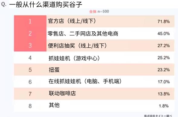 从获取周边的方式来看,在官方店(包含线上线下)购买的占比最高,为71.8%,其次是从零售店、二手网站及其他电商渠道购买,占比45%,第三是便利店抽赏(包含线上线下),占比27.2%。