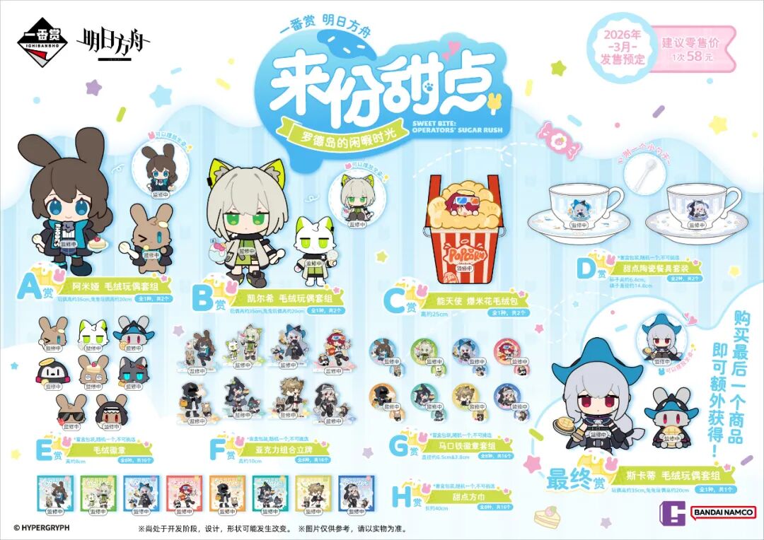 万代一番赏在中国也是频繁上新, 比如万代在中国10月29日公布的《明日方舟》“来份甜点~罗德岛的闲暇时光~”企划,AB与最终赏是人气角色的毛绒玩偶,其次包括毛绒包、陶瓷餐具、徽章、立牌、方巾等。