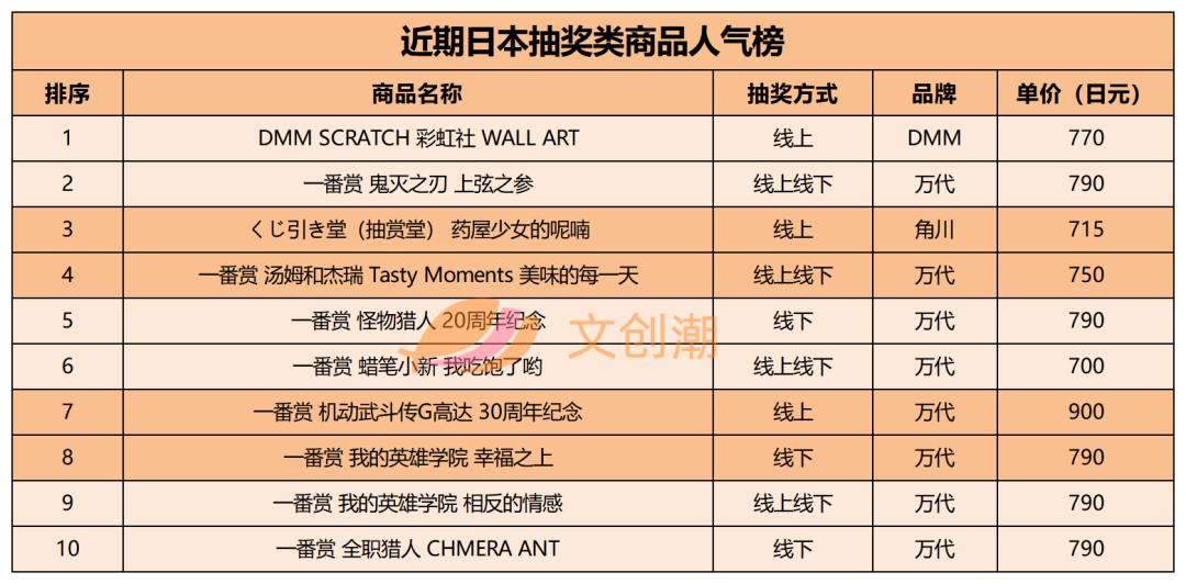 可见,抽赏IP几乎全是人气动漫,一番赏几乎霸榜。一番赏大奖多为手办类,不过根据IP调性,也有以厨房电器、餐具、玩偶为大奖的,如上表中的蜡笔小新、汤姆和杰瑞。不同品牌的抽赏奖品也各有侧重,如DMM、抽赏堂的奖品主打谷子杂货类。