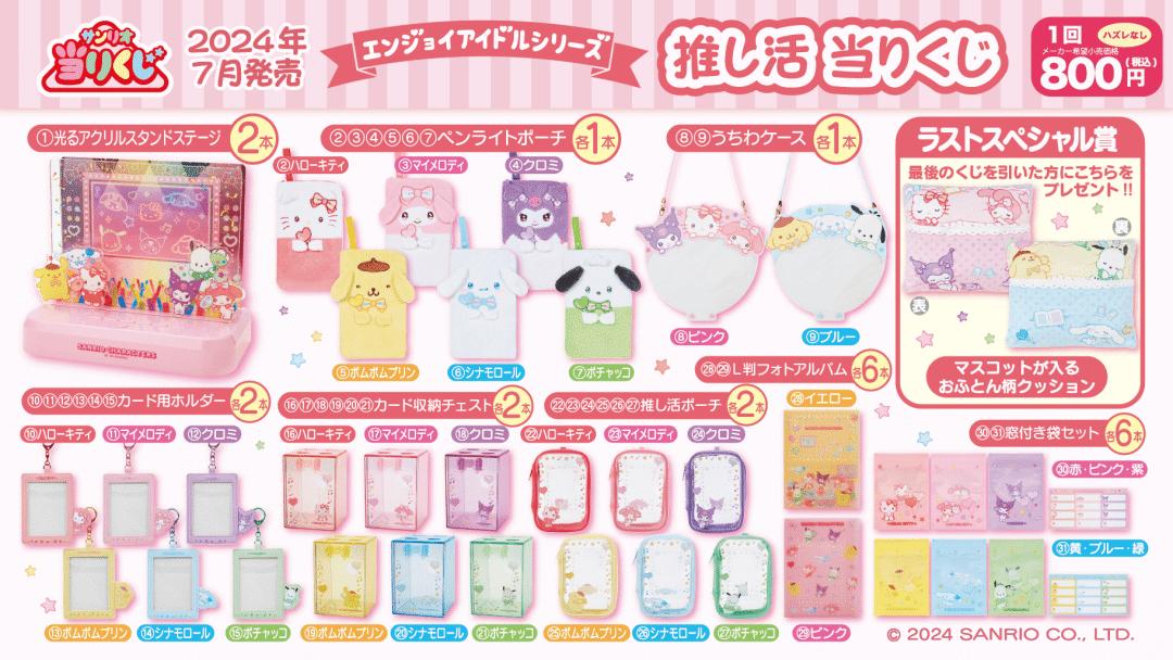 值得一提的是,2024年7月三丽鸥推出了一个推活系列抽赏,奖品全是三丽鸥主题的推活好物,如发光亚力克支架舞台、荧光棒收纳袋、团扇收纳袋、卡片收纳夹、手拿包、照片册等等。