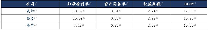 而销售净利率与资产周转率则呈现差异:格力销售净利率占优,但资产周转率仅为36%,分别为海尔的45%和美的的59%。