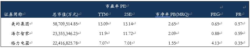 截至11月7日,家电三巨头市值分别为5871亿元、2334亿元和2242亿元,PE分别为13.09倍、11.09倍和7.07倍。
