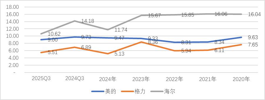 2025年前三季度,家电三巨头ROE均保持在15%以上,其中格力同比下降近三个百分点,这是在销售费用率下降的基础上实现的;美的与海尔同比略有优化。