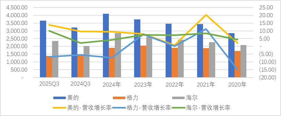 2020年,美的、格力、海尔的营收分别为2857万元、1705万元、2097万元;至2024年末,三者营收分别为当年的1.43倍、1.11倍和1.36倍。增速差异背后,反映的是企业产品力的延伸能力: