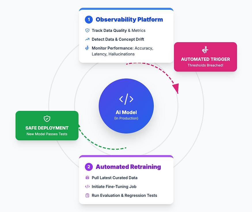 其次,你需要一个重训练流程,该流程会在收到监控系统触发的事件时自动激活。它必须完全自动化,负责提取最新版本的训练数据,启动模型重训练或微调任务,并对新训练的模型进行全面的评估和回归测试。在智能体时代,构建这种将性能监控直接连接到自动化部署的闭环系统,对于机器学习/ 数据工程师来说至关重要 , 两者之间的界限将日益模糊 。
