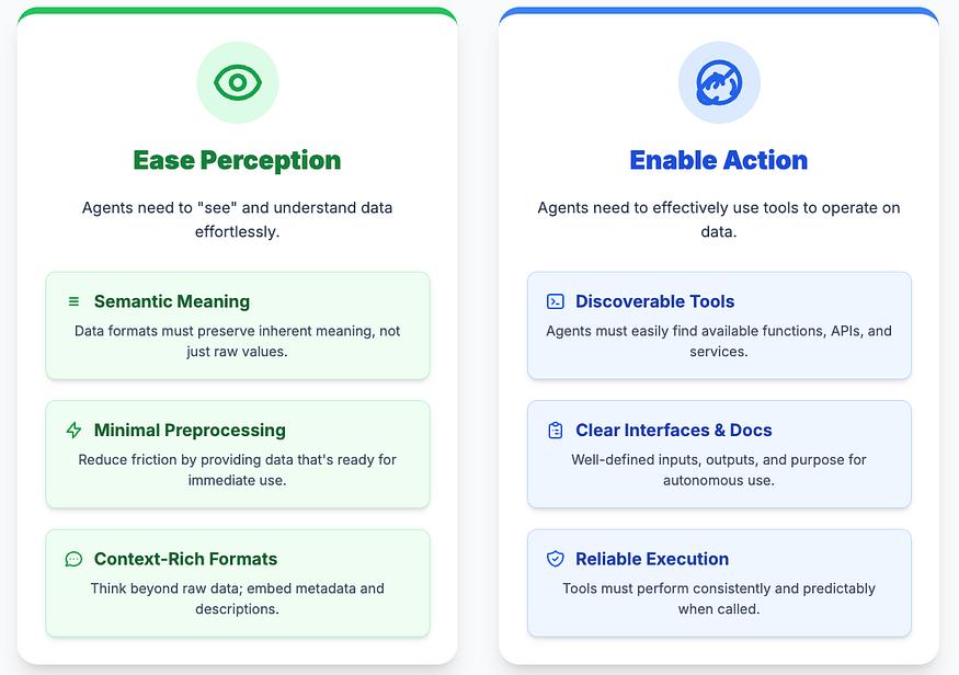 AI 代理通过调用工具(包括函数、API 和服务)来执行操作,这些工具使它们能够处理数据。您的基础架构需要确保代理能够发现并使用这些工具。这意味着清晰的接口、完善的文档和可靠的执行。