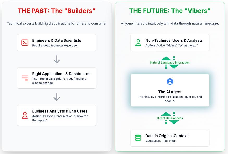 从以“构建者”为中心的模式(技术用户创建应用程序)过渡到以“交互者”为中心的模式(非技术用户通过人工智能代理直接与数据交互)。