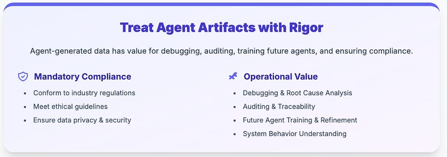 无论内容是由人工创建、从软件系统收集,还是由人工智能代理生成,都必须符合您所在行业的通用规范和法规。除了合规性之外,这些代理生成的数据对于调试、审计、训练未来的代理以及理解系统行为也具有价值。