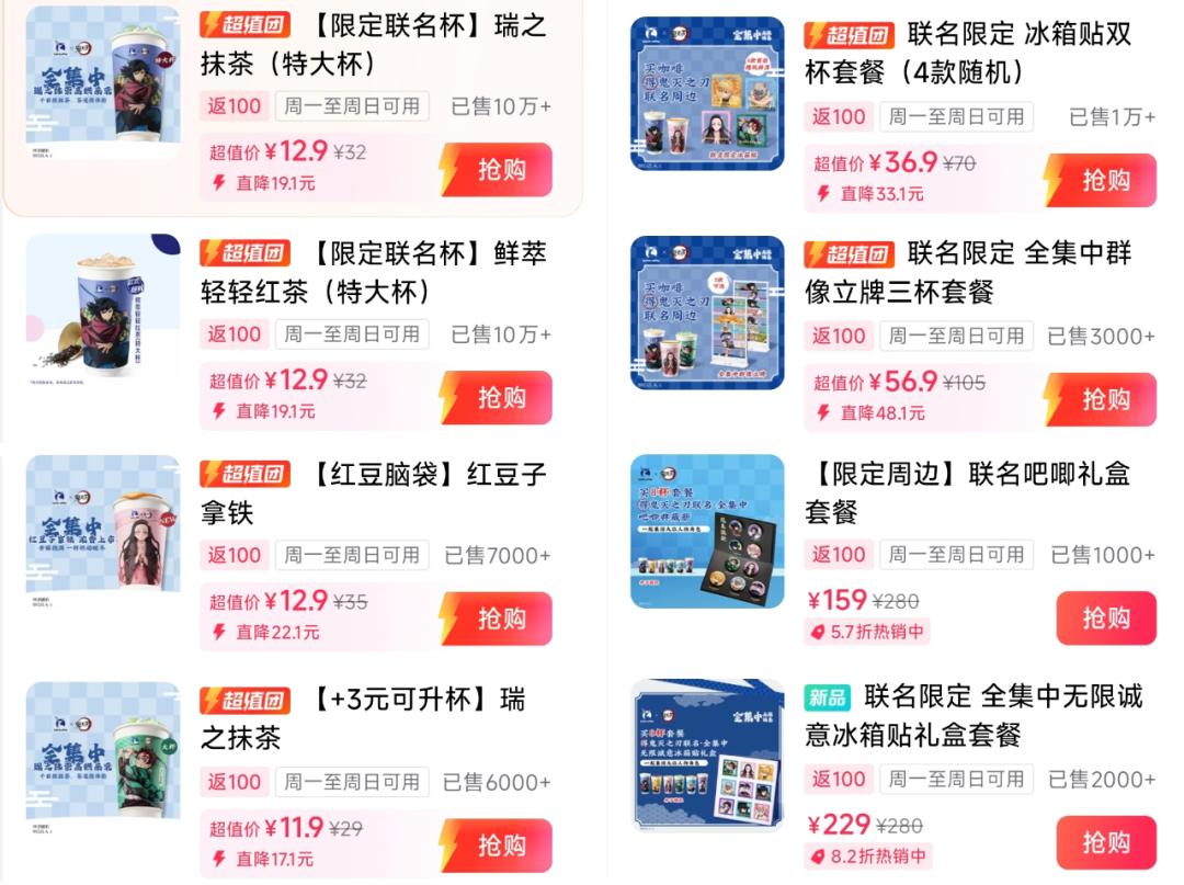 瑞幸咖啡与《鬼灭之刃》的联名可谓近期IP联名市场的热点事件。尽管从C端反馈来看,此次联名受定价过高、饮品绑定、柄图重复等老生常谈的因素的影响,整体口碑和销量均未达到预期。但作为头部国际IP,鬼灭带来的短期销售势能依然可观。据雷报粗略统计,联名饮品及套餐在抖音、美团总销售额分别有390.9+万元+及225.8+万元。