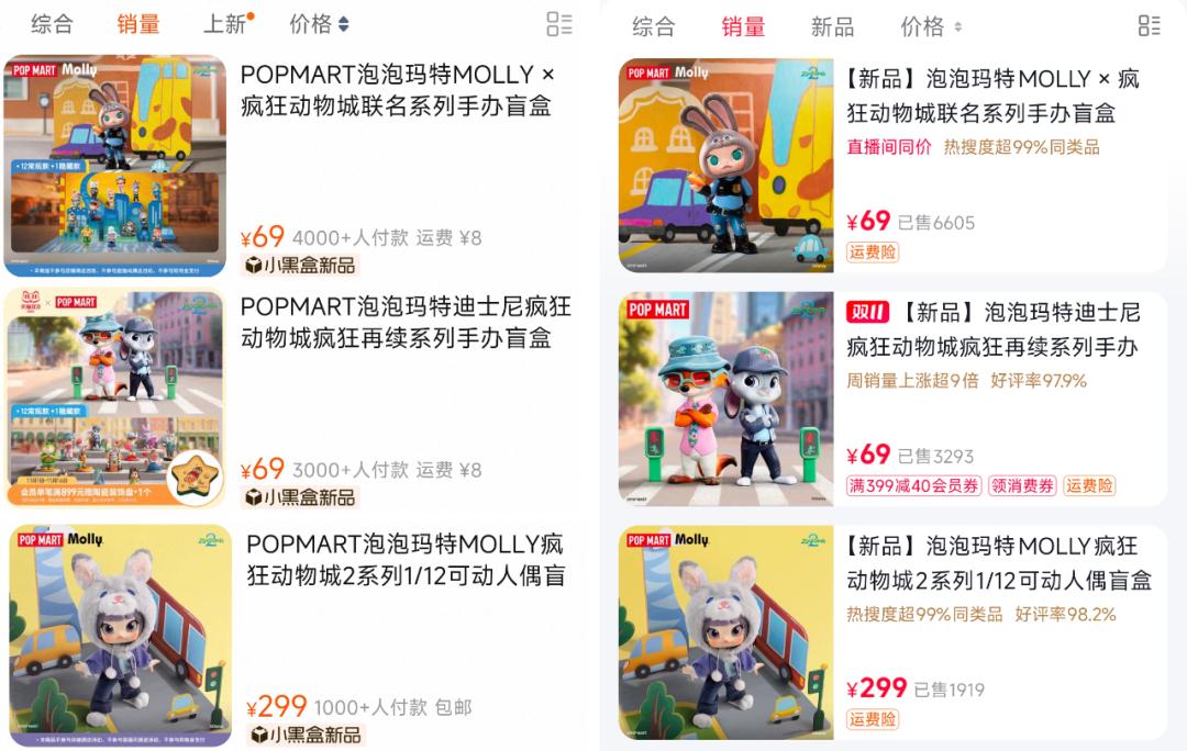 泡泡玛特与《疯狂动物城2》合作推出了3款产品,包括“疯狂再续系列手办”,以及与泡泡玛特旗下IP MOLLY合作的联名手办与可动人偶系列,不过整体销售表现并不算太好。在淘宝、抖音两大平台,三大系列的累计销售额分别达到105.8+万元及125.5+万元。