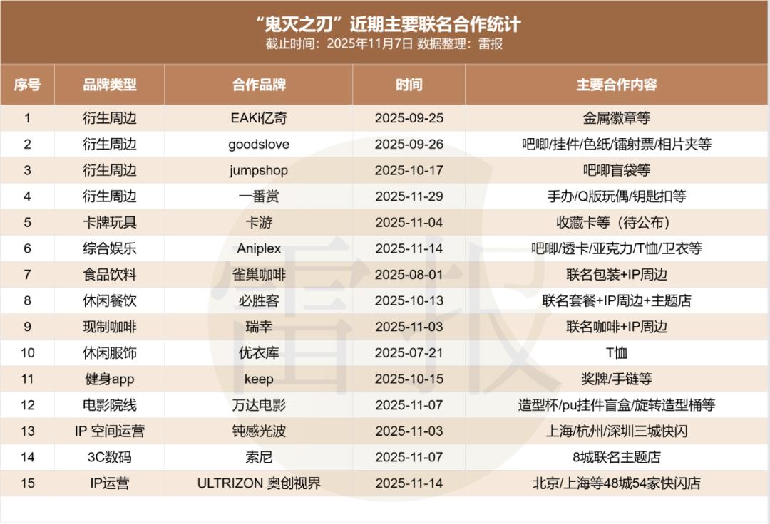 据雷报不完全统计,截至目前,“鬼灭之刃”与“疯狂动物城”已分别落地或官宣了15起及41起联名合作,名单如下: