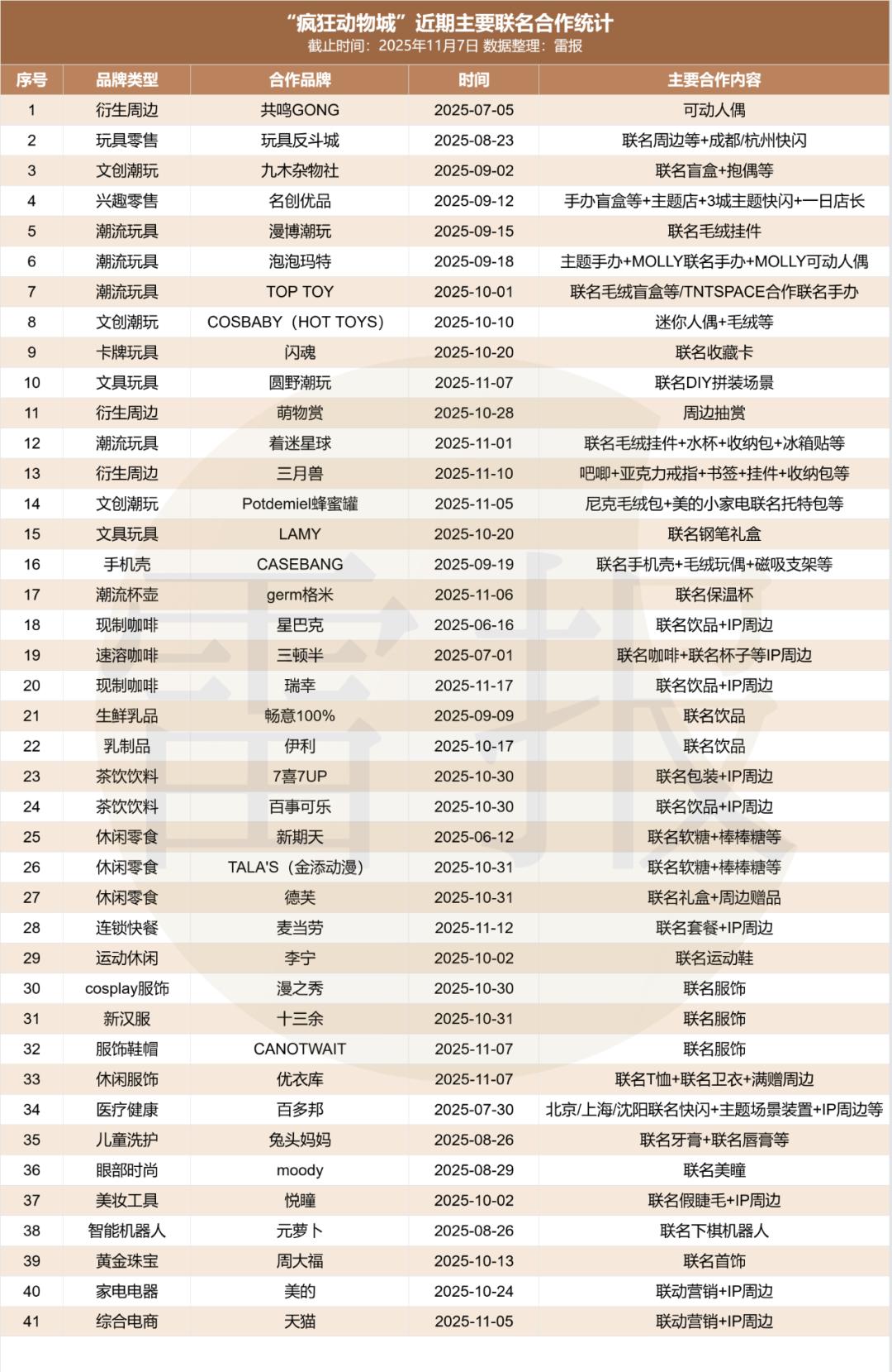 值得关注的是,这两大IP的商业爆发并未局限于银幕之内。在“情绪经济”崛起的大背景下,其商业化布局也早早在影片上映前抢先启动。据雷报不完全统计,截至目前,围绕两大IP展开的联名合作已超56起,覆盖谷子周边、潮玩手办、茶饮咖啡、休闲餐饮、服饰美妆、家电数码等多个消费赛道,形成全方位的商业布局。