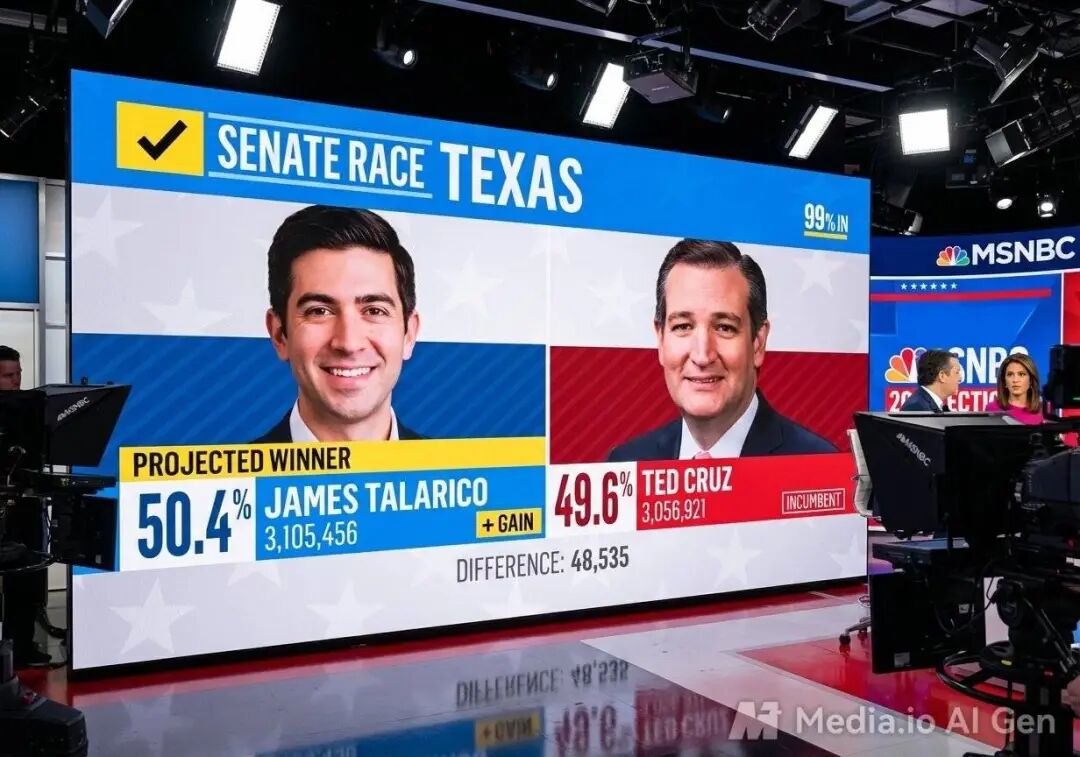 这张照片给我的感觉 AI 味也不算太重,但是它对背景屏幕做了虚化处理,反而让照片看起来不像是新闻节目的现场,而文字的反射也稍显刻意,它重点突出了主播的形象。