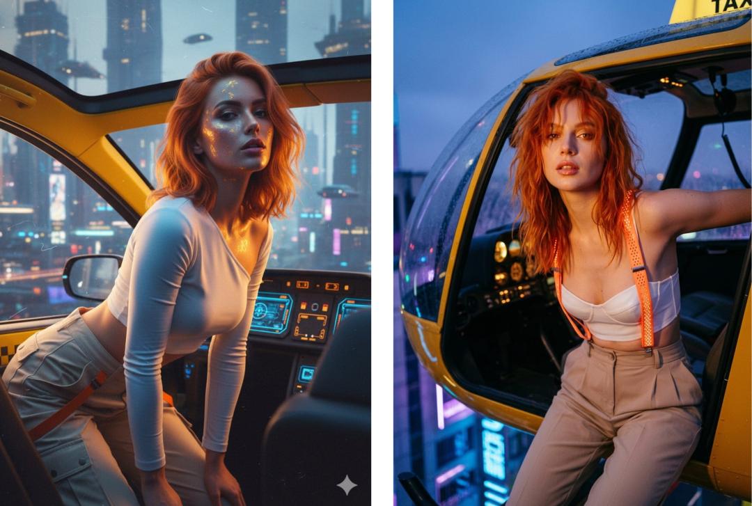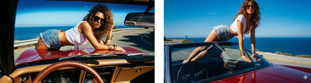 都是汽车模特在海边公路拍摄大片,但是很明显第一张图片色彩和风格更准确,没有专属于 AI 照片的「塑料感」。
