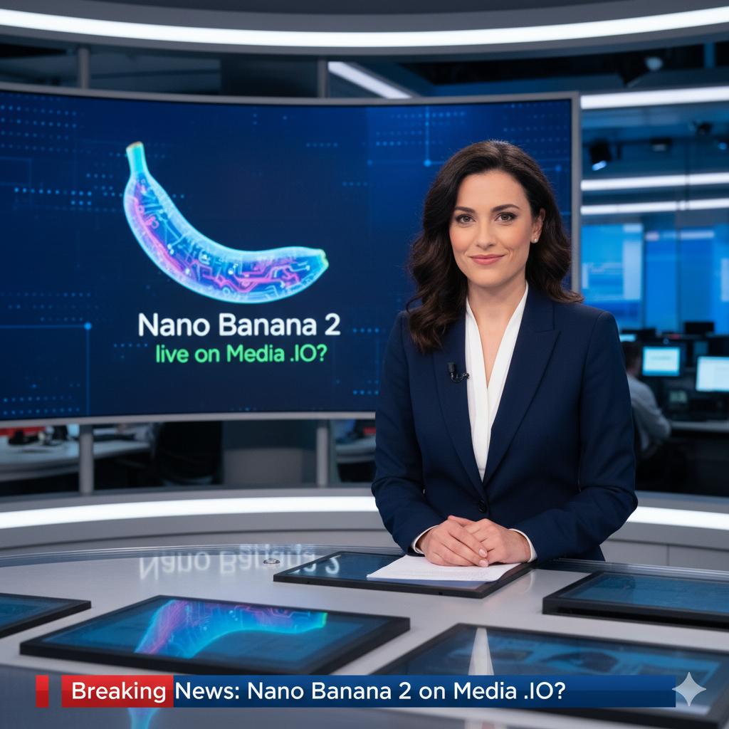 提示词:50mm big budget live broadcast 8k photograph close-up an attractive italian age 30 wry female news anchor. She is at a news desk and on a screen behind her is a bio engineered Banana with text "Nano Banana 2 live on Media .IO?" Live news shot. There is a red and blueckhyron on the bottom of the image that says "Breaking News: Nano Banana 2 on Media .IO?"|图片来源 x@BrentLynch