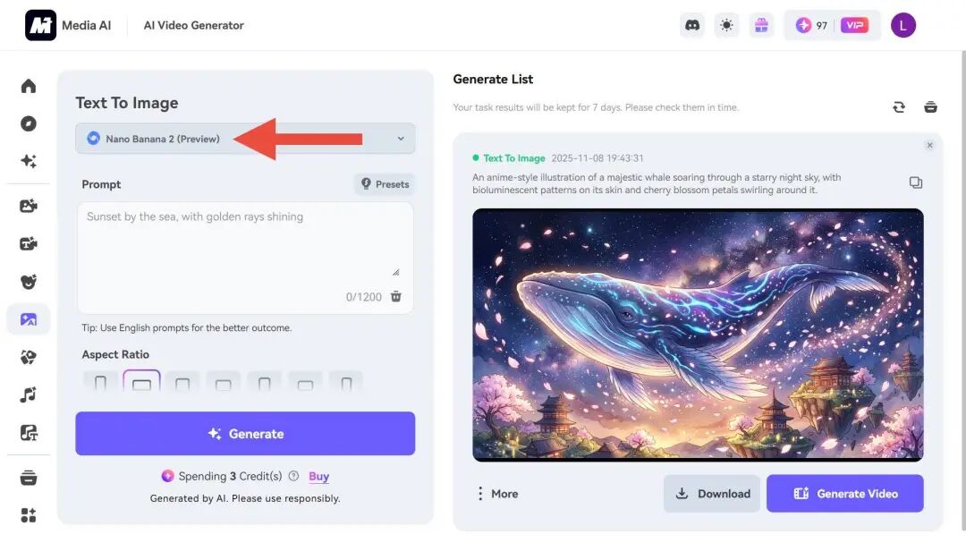 和 Nano Banana 最早在大模型竞技场,以抽卡的形式出现不同。Nano Banana 2 模型是在 media.io 上被爆料,用户可以在这个网站上体验 nano banana 2。