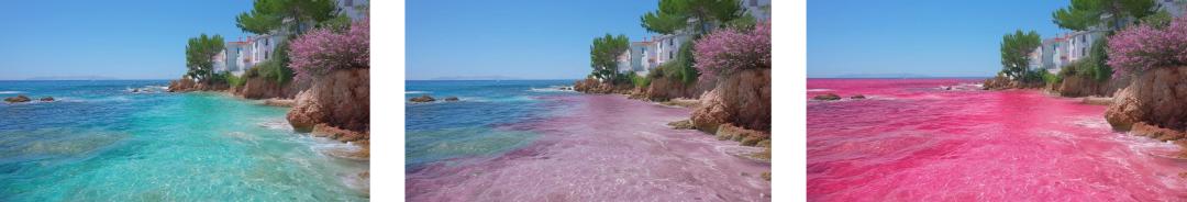 输入提示词,让水变粉红,依次是原始图像,Nano Banana 1,Nano Banana 2|图片来源 x@Angaisb_