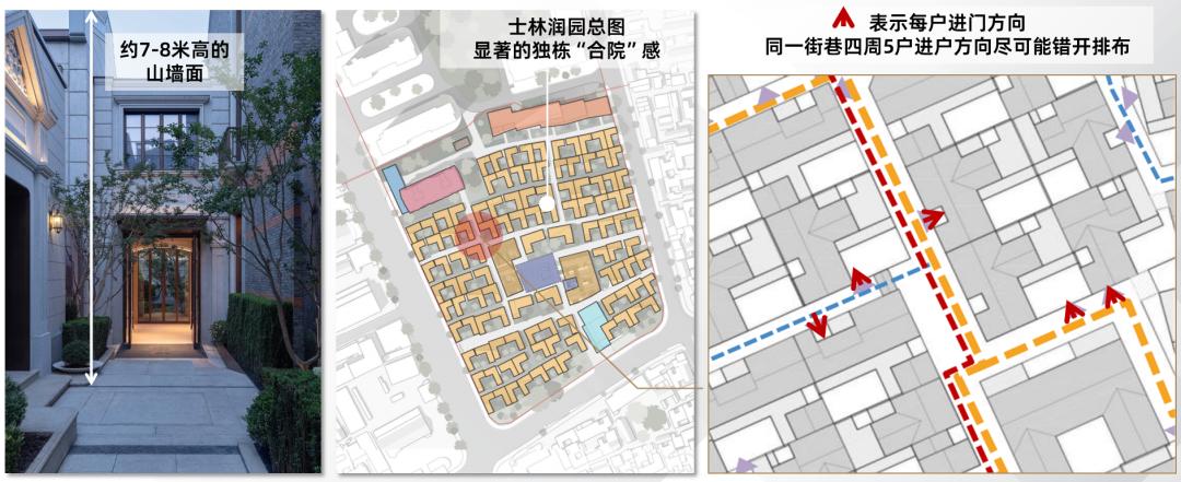 比如士林润园对入口方向的调整。受老城厢规划肌理制约,士林润园风貌别墅以「高院墙,窄进深」为特点。但项目很巧妙的一方面规划独栋双联排产品为主,加强独门独栋的合院感;另一方面,调节每户的入户方向尽可能各不相同,避免对视尴尬的同时,也强化了隐私,将高院墙的不利影响转化为单户私密性的优势。